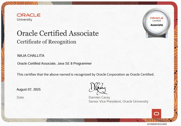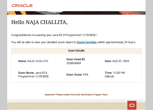 Successfully earned the Oracle Certified Associate (OCA) certification with a score of 93%, demonstrating strong proficiency in Java programming and object-oriented fundamentals.